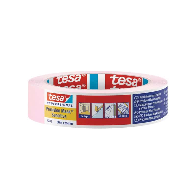 Η ταινία μασκαρίσματος tesa® Precision Mask® 4333 για ευαίσθητες επιφάνειες είναι ιδανική για εργασίες βαφής σε ευαίσθητες επιφάνειες, όπως επενδύσεις τοίχων, ταπετσαρίες και βερνικωμένες επιφάνειες. Ως επαγγελματική ταινία μασκαρίσματος είναι μεν εξαιρετικά απαλή αλλά εξακολουθεί να κολλάει σφιχτά. Επομένως εμποδίζει την διαρροή του χρώματος χωρίς να καταστρέφει την επιφάνεια. Αυτή η πρωτοποριακή επαγγελματική ταινία μασκαρίσματος περιλαμβάνει έναν ανθεκτικό στο σχίσιμο, εξαιρετικά λεπτό χάρτινο φορέα ο οποίος είναι επικαλυμμένος με ακρυλική συγκολλητική ουσία και είναι ιδιαίτερα εύκολη στη χρήση. Αυτή η νέα ταινία μασκαρίσματος αναπτύχθηκε ειδικά για εφαρμογές όπου η μέγιστη ακρίβεια είναι ζωτικής σημασίας.