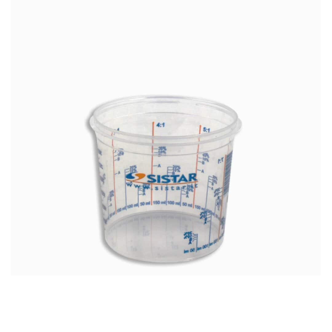Διαβαθμισμένο δοχείο, κατασκευασμένο από διαφανές πολυπροπυλένιο, για ανάμειξη χρωμάτων με βάση διαλύτη και νερό σε όγκο ή βάρος.