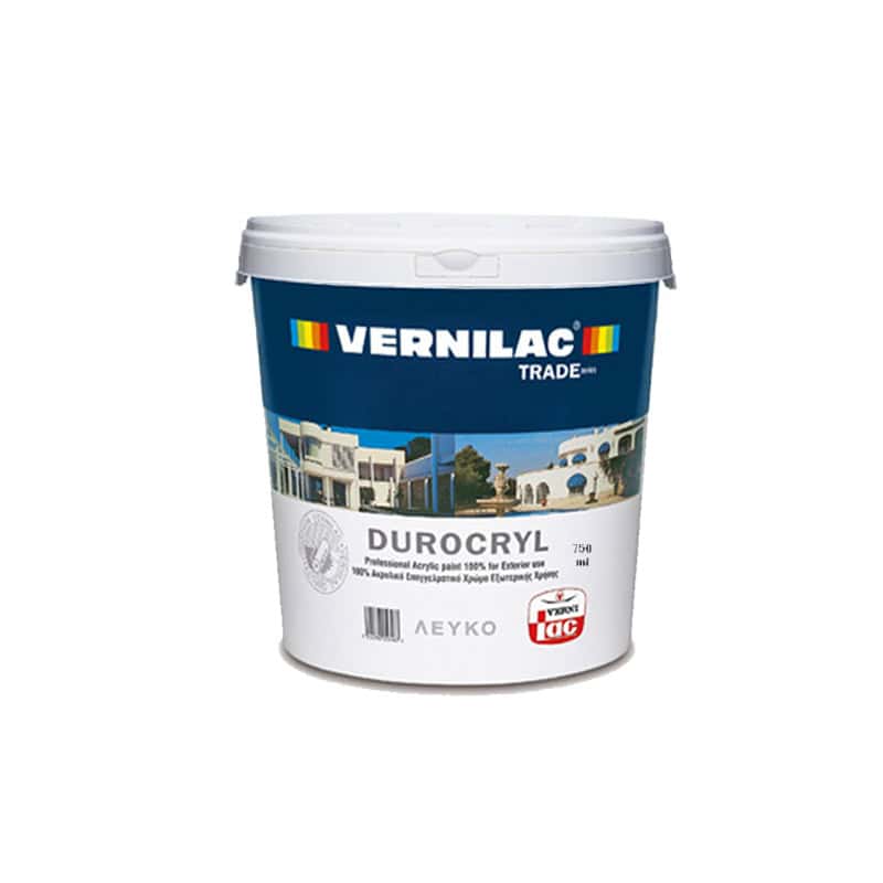 Oικονομικό πλαστικό χρώμα, κατασκευασμένο από 100% ακρυλικές ρητίνες, κατάλληλο για εφαρμογή σε εξωτερικούς τοίχους από μπετόν, σοβά, τούβλο, γυψοσανίδα, αμιαντοτσιμέντο, νοβοπάν, ξύλο, κ.λπ. Είναι ανθεκτικό, δεν κιτρινίζει, έχει πολύ μεγάλη καλυπτική ικανότητα και συνδυάζει ευκολία εφαρμογής, θαυμάσιο άπλωμα και γρήγορο στέγνωμα. Το DUROCRYL εμποδίζει την ανάπτυξη φωτιάς και την εξάπλωση της φλόγας και χαρίζει ένα ομοιόμορφο ματ τελείωμα που αδιαβροχοποιεί την επιφάνεια, ενώ ταυτόχρονα αφήνει τους τοίχους να αναπνέουν.