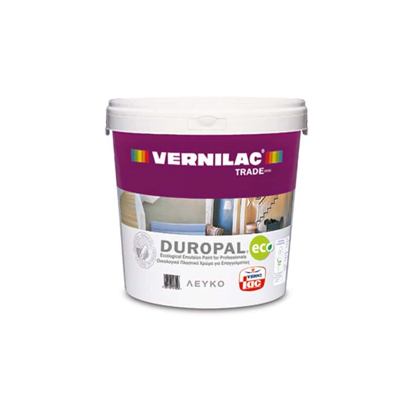 Οικονομικό πλαστικό χρώμα, υψηλής ποιότητας, με μεγάλη καλυπτική ικανότητα, κατάλληλο για την προστασία και διακόσμηση εσωτερικών χώρων. Είναι πιστοποιημένο από το Ανώτατο Συμβούλιο Απονομής Οικολογικού Σήματος (ΑΣΑΟΣ) της Ελλάδας, σύμφωνα με τα κριτήρια του Συμβουλίου Απονομής Οικολογικού Σήματος της Ευρωπαϊκής Ένωσης. Η ειδική σύνθεση του DUROPAL ECO, καθιστά το προϊόν φιλικό στο χρήστη και το περιβάλλον γιατί είναι άοσμο και δεν περιέχει επικίνδυνες ουσίες όπως αμμωνία, βαρέα μέταλλα, αρωματικούς υδρογονάνθρακες, ελεύθερη φορμαλδεΰδη ή αλκυλοφαινολαιθοξυλικές ενώσεις. Εφαρμόζεται εύκολα, απλώνει θαυμάσια, στεγνώνει γρήγορα και προσφέρει μία λεία και ομοιόμορφη ματ επιφάνεια. Το DUROPAL ECO συνδυάζει υψηλή απόδοση, μεγάλη καλυπτικότητα και αντοχή στις περιβαλλοντικές συνθήκες, ενώ ταυτόχρονα εμποδίζει την ανάπτυξη της φωτιάς και την εξάπλωση της φλόγας.