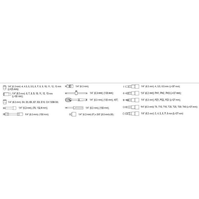 - Σετ περιλαμβάνει μια πλήρη γκάμα 56 τεμαχίων 1/4 “,