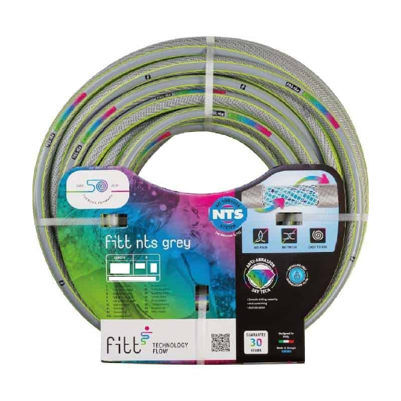 Εύκαμπτο λάστιχο κήπου της σειράς NTS GREY διαμέτρου 1/2”  και μήκους 15 μέτρων. Ανθεκτικό στις καταπονήσεις, την τριβή, τα κοψίματα. Εσωτερικό στρώμα από λευκό PVC, δεν κρατάει υπολλείματα. Χάρη στην ειδική πλέξη αποτρέπεται το τσάκισμα και η ροή του νερού παραμένει αδιάλλειπτη.