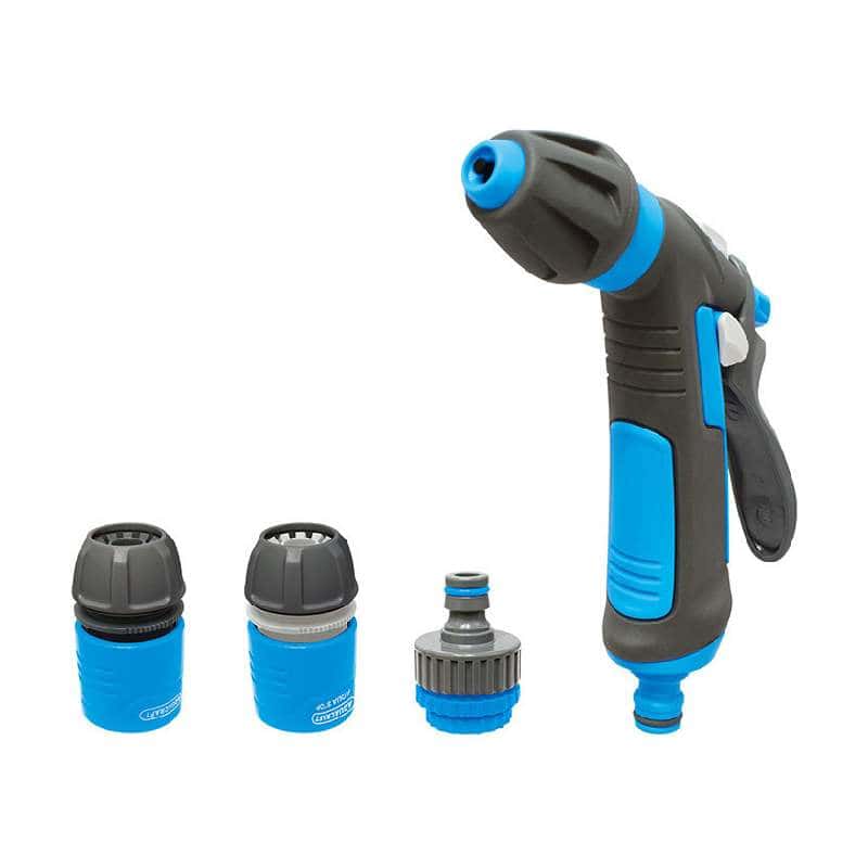 Πιστόλι ψεκασμού με ταχυσυνδέσμους από την Aquacraft. Κατασκευή από πλαστικό με μαλακή ελαστική επένδυση για άνετη χρήση. Πλήρως ρυθμιζόμενη ταχύτητα ροής. 2 τύποι ψεκασμού και ρυθμιστής από αντιολισθητικό ελαστικό για εύκολη εναλλαγή.