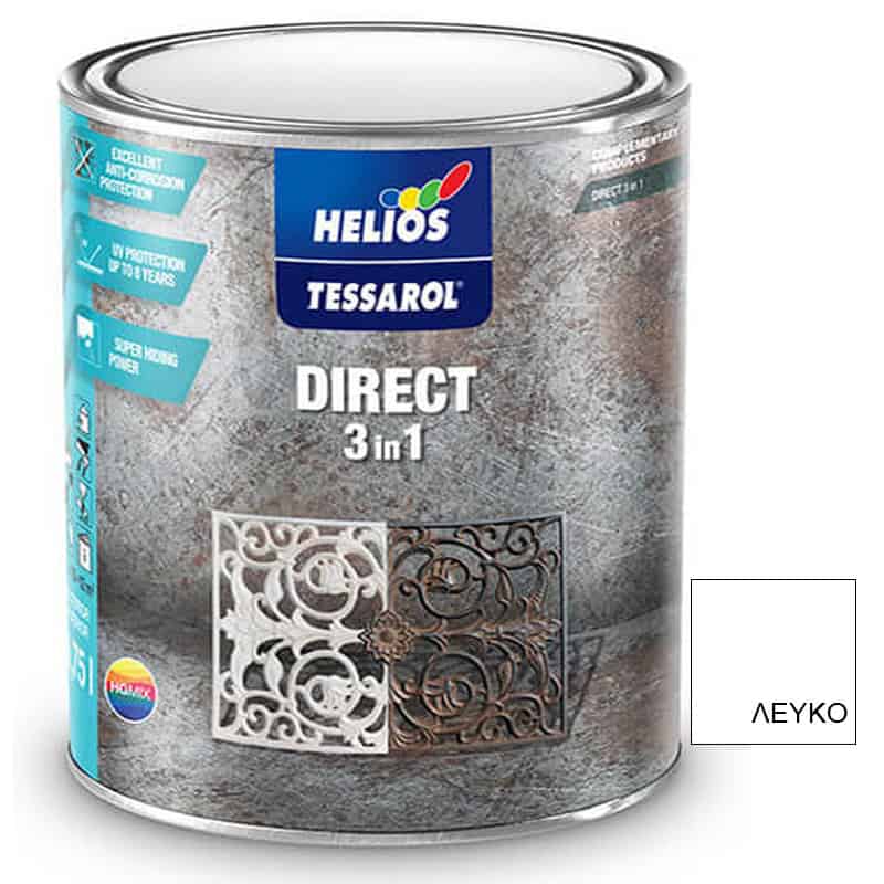TESSAROL DIRECT 3in1 είναι ένα αντιδιαβρωτικό τελικό χρώμα που χρησιμοποιείται για τη διακόσμηση και προστασία μεταλλικών επιφανειών από σίδηρο και χάλυβα. Μπορεί να εφαρμοστεί απευθείας σε στεγνή και λειασμένη επιφάνεια, καθαρισμένη από τραχιά σωματίδια σκουριάς. Χάρη στις εξαιρετικές αντιδιαβρωτικές του ιδιότητες, μπορεί να εφαρμοστεί απευθείας στην επιφάνεια χωρίς προηγούμενη εφαρμογή υποστρώματος (primer). Δημιουργεί ένα γυαλιστερό τελικό φινίρισμα στις βαμμένες επιφάνειες, προστατεύοντας ταυτόχρονα την επιφάνεια από τη σκουριά.